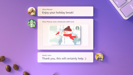 Connect and spread virtual joy this holiday season with the Starbucks App in Microsoft Teams. It’s one of our favorite apps that makes gifting as simple as sending a Teams chat to recognize and celeb...