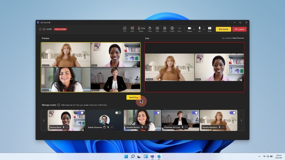 - Specify who can manage the screen: A new option in town hall lets organizers designate who has control of managing the screen during the event. Similar to Teams Live Events, selected individuals will be able to start the event, manage what attendees see, and end the event, helping to ensure a more cohesive event experience. The different options that can be selected are “Organizer, co-organizers, and presenters”, “Organizer and co-organizer only” and “Specific people”. This feature is now generally available for town hall only.