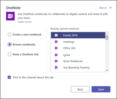 Include existing OneNote notebooks as a tab – To enable you to better collaborate on existing projects in Teams, you can now choose between three options when you create a OneNote tab in a channel: 1. Create a new notebook, 2. Browse recently opened notebooks, or 3. Paste a OneNote link.