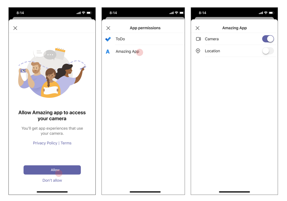 Support for native mobile device capabilities for Teams apps using tabs is now generally available! Developers, including those building Teams apps through Power Apps, will be able to use device permissions to build richer experiences, such as capturing images through the camera or providing GPS coordinates. This experience had been supported for the Teams desktop client and is being introduced to the Teams mobile app via new APIs.