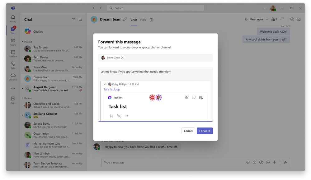You can now forward chat messages containing Loop components, allowing for seamless sharing and real-time collaboration across different chats and channels. To forward a message with a Loop component, navigate to it, click on the ellipsis (three dots), and select ‘Forward’ from the menu. When the Loop components are shared, their permissions are maintained, ensuring that recipients have the appropriate access rights. This feature is available on desktop and mobile.