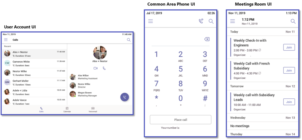 User-based account experiences: The user interface on the phone is customized based on the type of user account used to sign into the phone. User accounts provide all calling, meeting and voicemail experiences to individual users. For meeting room accounts, these can be set based on IP phone policies assigned to the user account.