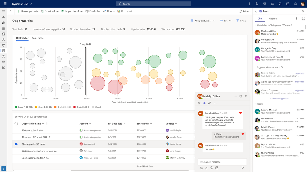 Stay in the flow of work with new Dynamics 365 Sales, Marketing, Customer Service, Field Service, and Teams connected experiences. Take advantage of Teams capabilities like chatting, sharing documents, and managing meeting and webinar invites without leaving the Dynamics 365 workspace. You can also securely access, update, and share Dynamics 365 records from within Microsoft Teams. These features will be rolling out in April.
