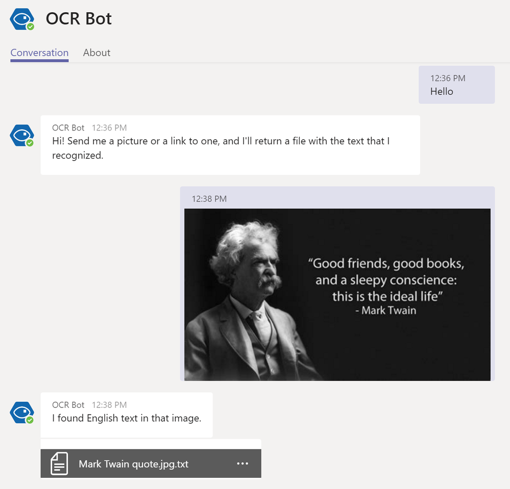 To help get you started, I’ll explain how the feature works, and walk through a sample app that shows it in action. The bot uses the Azure Computer Vision API to recognize text in an image, then sends the text back to the user as a file. If you want to dive straight into code, the source for the sample is up on Github for both Node.js and C#.