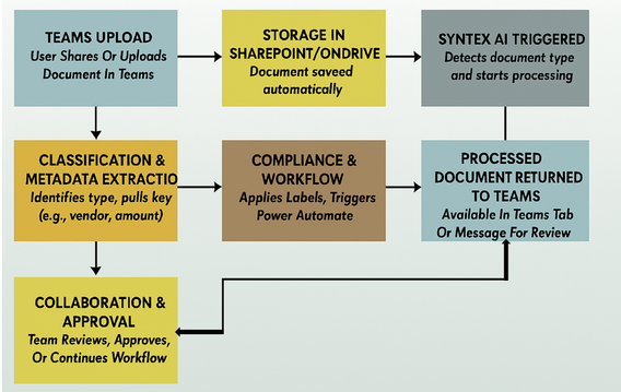 Syntex uses AI models to classify documents and extract metadata. For example, it can identify an invoice, extract the vendor name, amount, and due date, and tag it for easy retrieval whether it's stored in SharePoint or shared in a Teams channel. - Content Processing