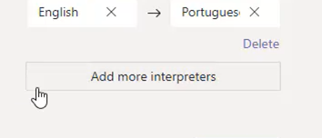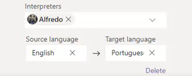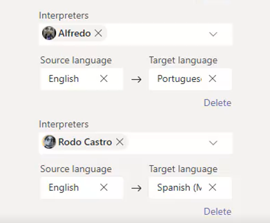 f. You can see I added two interpreters, one for Spanish and one for Portuguese. Both have Source language English as will be the main language during the meeting.