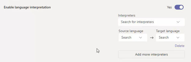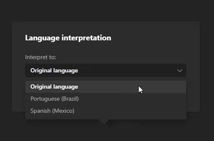 How it works? Language Interpretation allows interpreters (in fact, this is a new role for meetings) to join into a meeting and convert what the speaker says into another language in real-time. As the interpreter will be defined with an output language the original audio of the speaker will not suffer any interruption. Is like selecting the right radio channel. Of course, that means that you can have more than one language interpreter to allow other to select which language to listen.