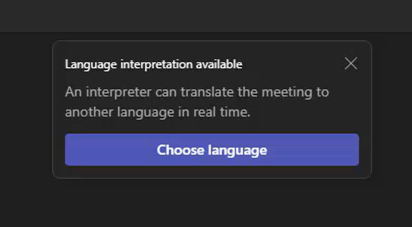 As soon as the user joins to the meeting a notification will appear at the middle of the Teams Client, letting user know an interpreter can translate the meeting to another language in real time.