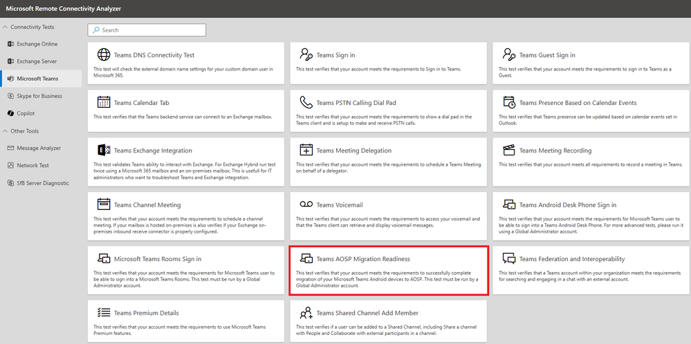 To access the new customer facing diagnostic, navigate to Microsoft Remote Connectivity Analyzer, select Microsoft Teams, then click on the “Teams AOSP Migration Readiness”.