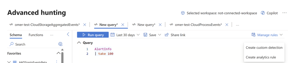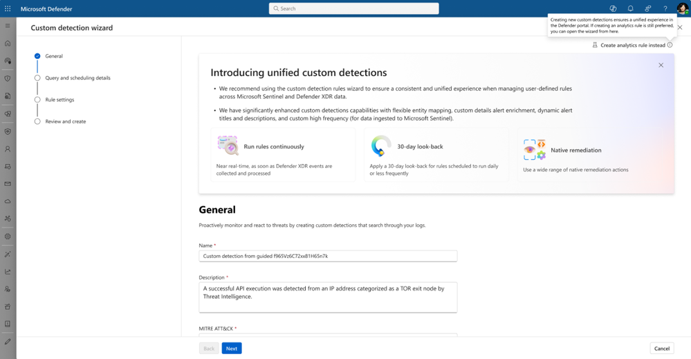 Custom detection is the default wizard when creating a detection from advanced hunting. If your use case still requires using an analytics rule, you can click on the “create analytics rule” button from the custom detection wizard.
