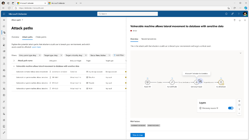 Figure 2: Attack path mapping in Microsoft Defender illustrates a scenario where a resource contains a service principal certificate that can authenticate asa service principal with permissions to a sensitive database. This represents a risky lateral movement path — one that is now visible and can be proactively secured.