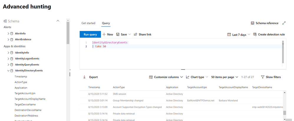The new IdentityDirectoryEvents table—available in public preview—incorporates data from the Azure Advanced Threat Protection (Azure ATP) sensor, including various identity-related activities, such as account password changes or remote creation of scheduled tasks on the domain controller.