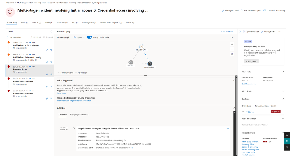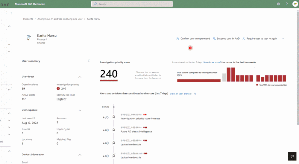 Investigating Azure AD identity compromise alerts as part of the end-to-end incident helps security teams more easily determine root cause, identify affected identities in the attack, and handle the compromised identities more quickly and efficiently. For example, you can suspend specific accounts to block an attack progression and limit its impact. You can also confirm a user as compromised to move them to high risk in Identity Protection and trigger the aforementioned risky user policy to securely change their password.