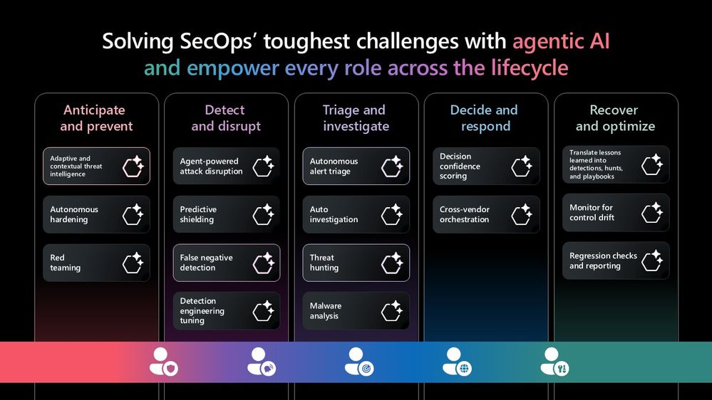 Today, we are taking the first step in shifting security operations from static controls to autonomous defense and from manual toil to agentic operations. But we have an ambitious vision to augment and evolve these AI capabilities and agents across the entire SOC lifecycle and are excited to share some of that vision, as shown in the below graphic, with you at Microsoft Ignite.