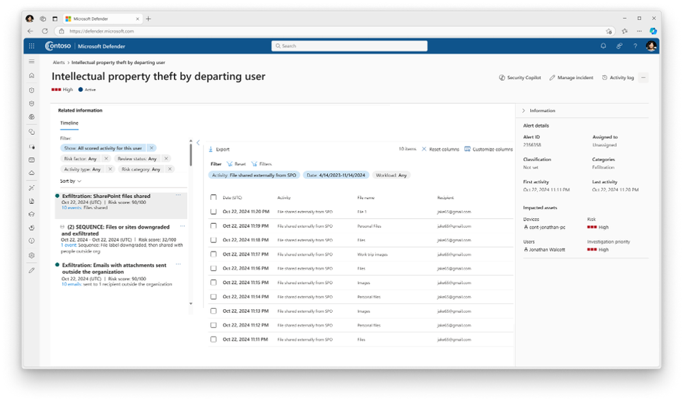 While detection and protection logic is critical to an effective response, so is the breadth of signal that is natively correlated without cumbersome, manual work by the security team. Earlier this year at RSA, we introduced the integration between Microsoft Purview Insider Risk Management (IRM) and Defender XDR, which added context to a user’s activity timeline with insights from IRM. Today, we are excited to share that IRM alerts are now automatically correlated into the unified incident experience in Defender, with complete alert context. In addition, we are providing new data security tables in advanced hunting, so analysts can build queries to better understand the impact of incidents and more easily identify attack patterns. Of course, all this data is also available through the Graph API so customers can integrate it into their case management workflows.