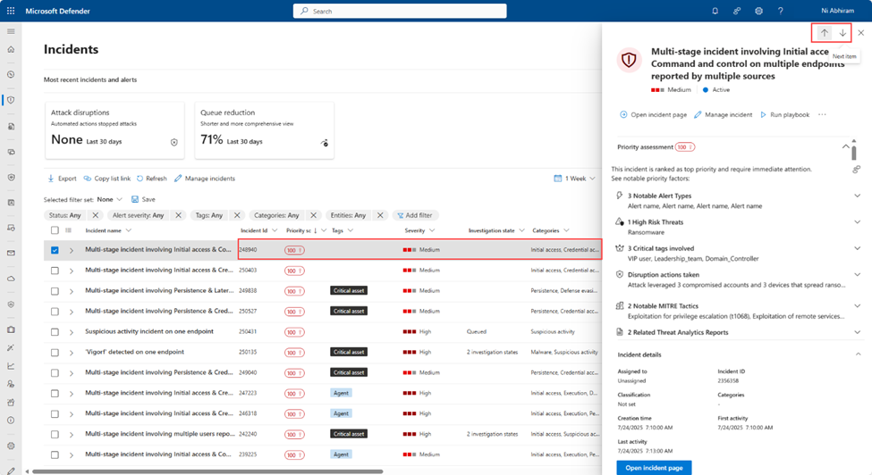 Figure 1. Select the incident row anywhere except the incident name, to display a summary pane with key information about why this incident was prioritized.Built for analyst flow, not just ranking. Selecting an incident row opens a summary pane that keeps analysts in the moment of triage (see Figure 2).