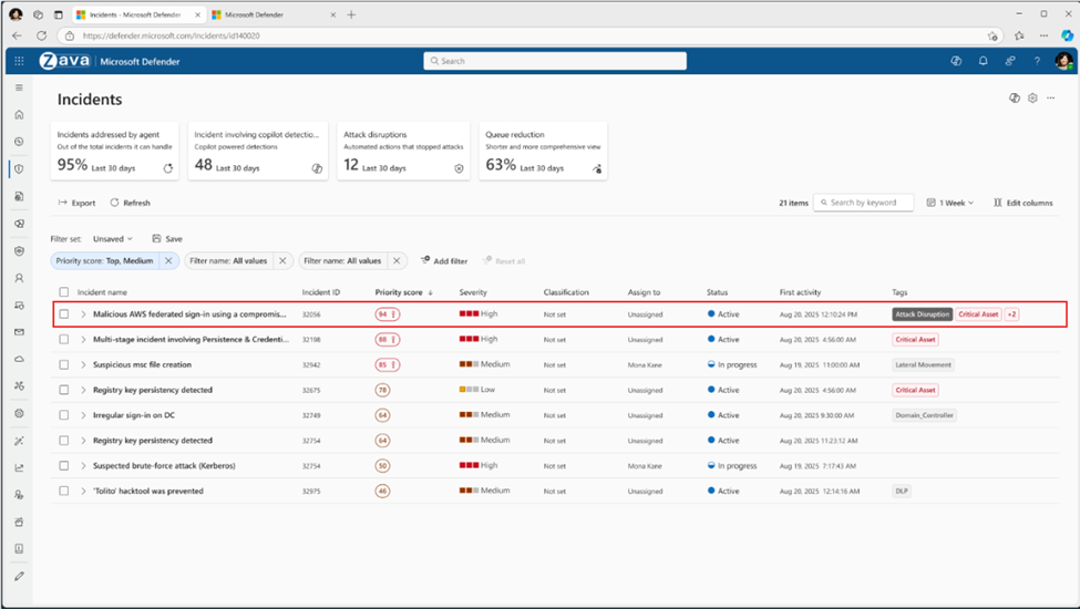 Prior to the new incident queue experience, incidents were prioritized using factors like alert severity, tags, and MITRE techniques. We’ve since expanded this approach to incorporate additional high‑signal inputs which include automatic attack disruption signals, high‑profile threats (such as ransomware or nation‑state activity), asset criticality, threat analytics, and more. This enhanced prioritization model is designed to work across signals from Defender, Sentinel, and custom alerts, ensuring a more accurate and comprehensive assessment of incident priority.