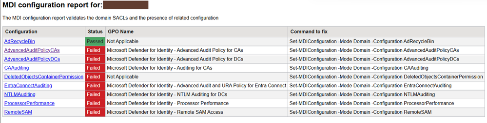 • The Domain mode will validate the existence of the Group Policy Objects (GPOs) created by the Set-MDIConfiguration function, and that they contain the correct configuration, are linked, and enabled.