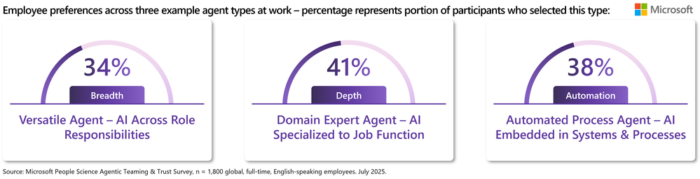 The Agentic Teaming & Trust Study was conducted by the Microsoft People Science team utilizing an Online Panel Vendor, commissioned by Microsoft, with 1,800 full-time employees across nine markets between June 11, 2025 and July 7, 2025. This survey was 12 minutes in length and conducted online. Global results have been aggregated across all responses to provide a total or average. Each sample was representative of business leaders across regions, ages, and industries (i.e., Construction, Financial & Professional Services, Retail, Food, & Beverage, Healthcare, Media & Entertainment, Technology, Transportation, Travel, & Hospitality). Each sample included specific parameters on company size (i.e., organizations with 1,000+ employees) and job level (i.e., business leaders/business decision makers, those in mid- to upper job levels such as C-level executive, VP or director, Manager). The overall sampling error rate is 2.31 percent at the 95 percent level of confidence. Markets surveyed include Brazil, China, France, Germany, India, Japan, Mexico, United Kingdom, and the United States. Findings represent aggregated responses and may not reflect all organizations or industries.