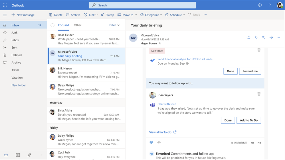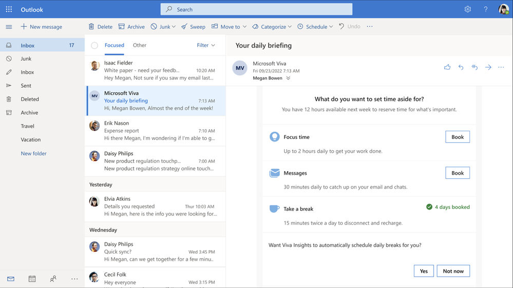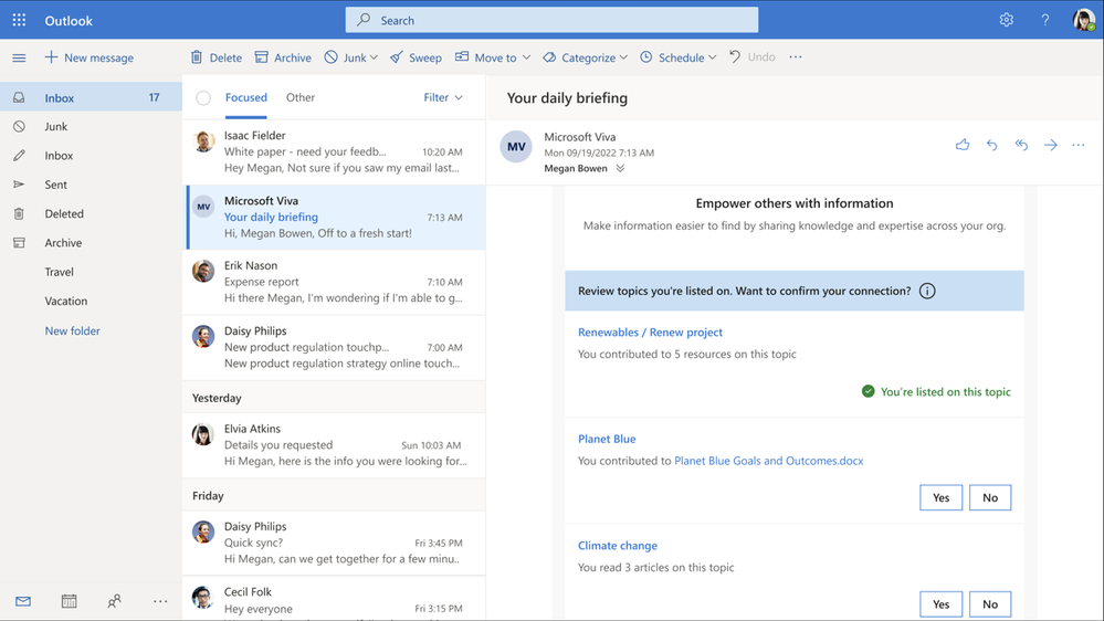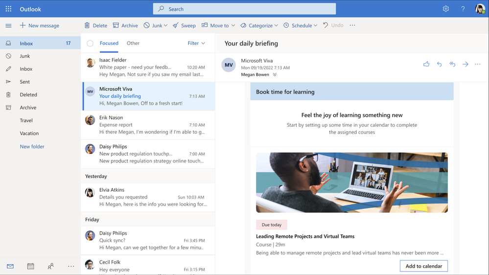 We’re also enhancing the daily briefing email from Microsoft Viva to highlight key information from Viva apps directly in your inbox. The briefing email provides a summary of important insights to help you make the most of the day and week ahead. Soon, briefing will also surface personalized employee experience data, including learning reminders, suggested topics, and meeting recaps. Read on for more details.