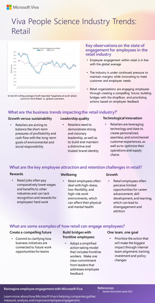 According to Glint benchmark data (2023), employee engagement in retail has declined by two points between 2021 and 2022. It’s clear that retailers need to invest in improving the employee experience, especially for the frontline workers, who are the face of the brand and the key to customer loyalty. So, how do they do this? Here are three examples of how retailers we’ve worked with have addressed the needs of their employees with the support of Microsoft Viva: