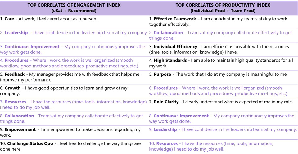 We recommend you consider the productivity results (at the team and / or individual level) you wish to improve and use it as a guidepost for which employee experiences to focus on to best drive that outcome. An index made of the two productivity items is an alternative that can be utilized when a dual approach (capturing both team and individual productivity) is needed.