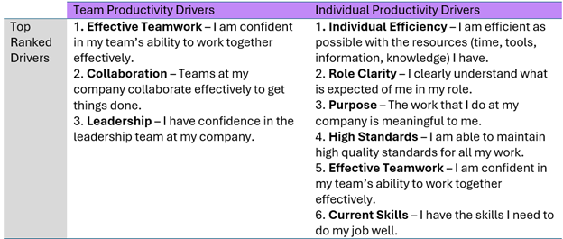 Further analyses resulted in the discovery that team and individual productivity are distinct experiences when viewed from an employee's perspective. We identified the top eight factors that most influence a person’s sense of high productivity – and the factors that contribute to higher perceptions of team productivity differ from those contributing to higher perceptions of individual productivity.