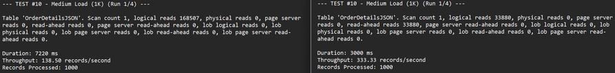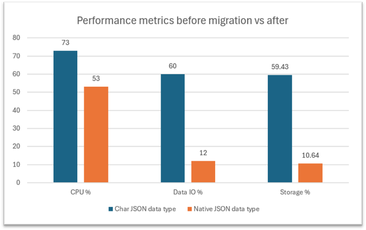 The migration didn’t just shrink storage - it made JSON workloads easier for the engine to process. With the native JSON type, the same workload completed with ~27% lower CPU and ~80% lower Data IO.