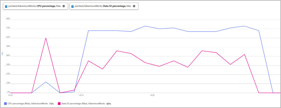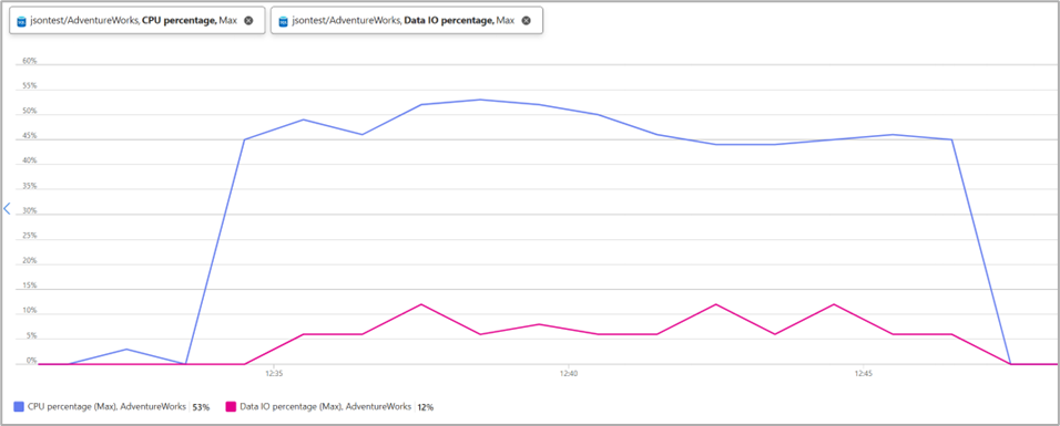 During the 12-minute continuous workload, JSON stored as nvarchar/varchar showed consistent resource pressure, primarily on CPU and storage IO. The monitoring tools reported: