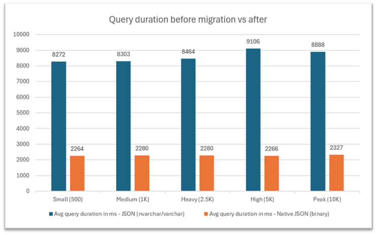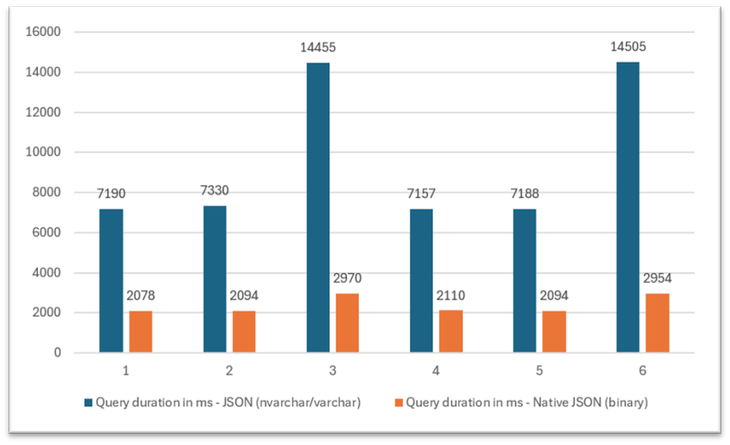 This blog shares the performance gains observed after migrating JSON from nvarchar/varchar to the native JSON binary type. Results will vary across JSON structures and workloads, so consider this a guide rather than a universal benchmark.