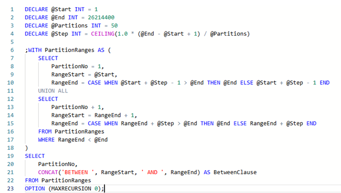 Lookup: In the Settings tab, select the SQL dataset as the source. Instead of choosing the entire table, go to the “Use query” section and provide the query shown below. This query uses a recursive Common Table Expression (CTE) to dynamically generate partition ranges across a large integer sequence (representing the total number of rows).