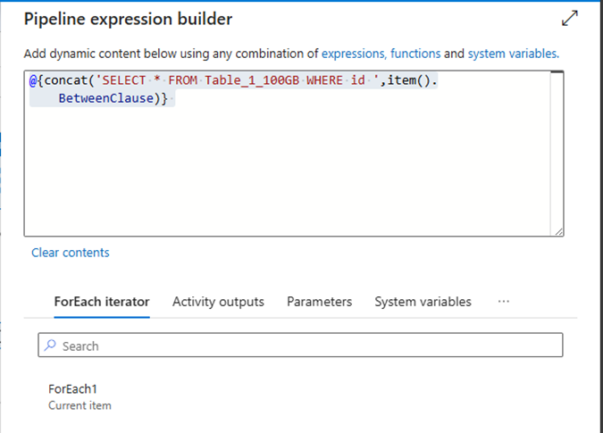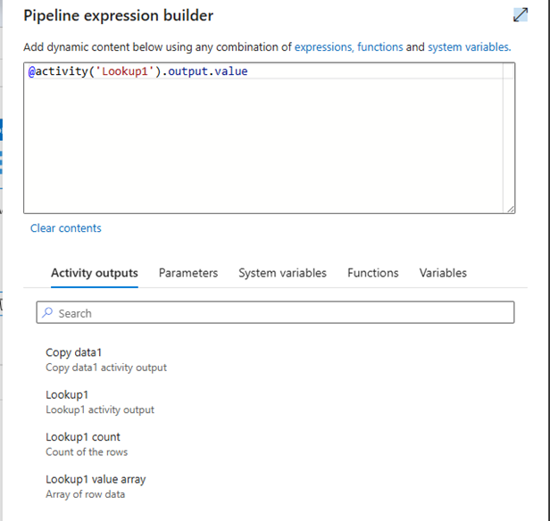 ForEach: Use this query in the Pipeline expression builder which is a reference to the Lookup output in our pipeline.