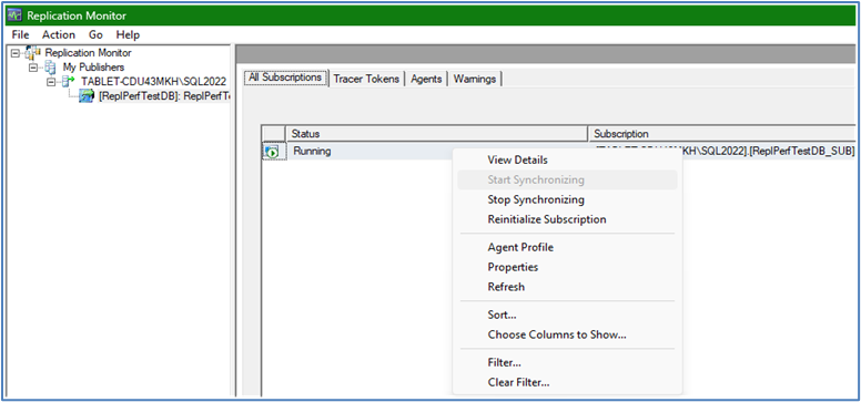 18. In the Replication monitor, go to All Subscriptions tab, right click on subscription and select start synchronization. This will start the distribution agent.
