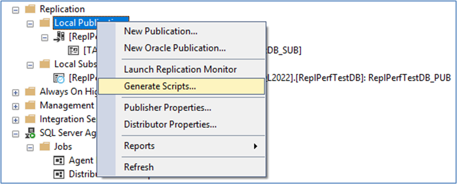 - Script publication: Right click on the Local Publication folder and select Generate Scripts or, please use below TSQL to confirm.