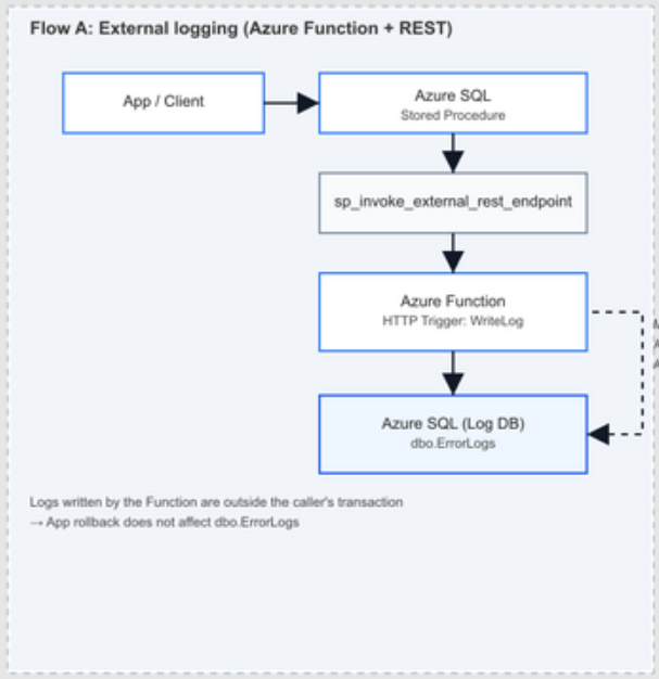 - External logging via sp_invoke_external_rest_endpoint to an Azure Function