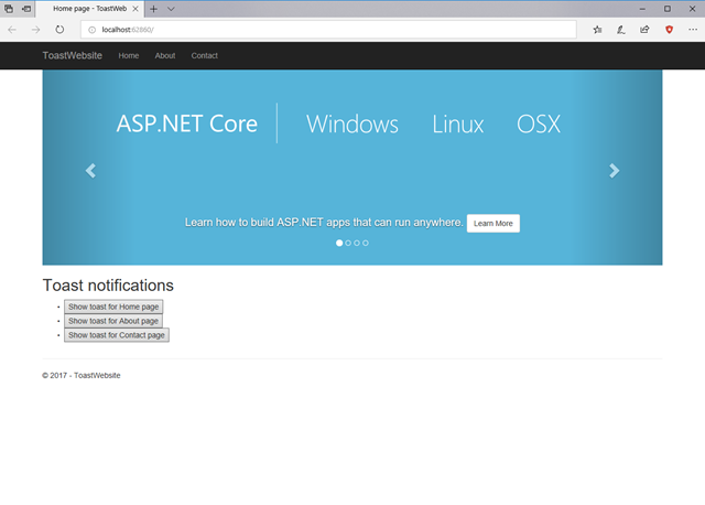 However, if you click on any of the buttons nothing will happen. This is the expected behavior, since we have made the showToast() function available only if we are running in the context of a Progressive Web App in Windows. Since we are just running inside Edge, the code is ignored and no JavaScript errors are raised. In order to try the code, we need first to package the website as an application. The easiest way is to publish the website somewhere and then create a Progressive Web App which points to the website’s URL thanks to the dedicated Visual Studio template. In my case, I’ve used a Web App hosted on Azure: the free plan is more than enough for my testing purposes and the publishing flow is extremely easy, since it’s integrated in Visual Studio. You can just right click on the website’s project, choose Publish and then you’ll be able to login to your Azure account and choose one of the existing App Services or create a new one directly from the wizard. At the end of the process, your website will be available at a URL like yourcustomname.azurewebsites.net . If you don’t have the chance to publish your website, you can leverage the one I have already published at https://toastwebsite.azurewebsites.net/