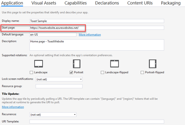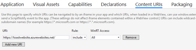 As you can see the option WinRT Access is set to All . This means that our website will be able to use server side code to access to the UWP APIs. Without this entry in the manifest, the code we have written before to send a toast notification wouldn’t work even when the website is running packaged as an app.