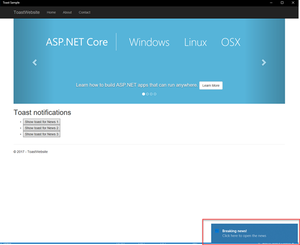 Now you can press F5 and deploy the application on your machine. The look & feel will be exactly the same of your website running in a browser. However, if you click on one of the buttons we have previously added, this time you will see a toast notification popping out on the bottom right corner of the screen: