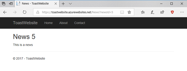 Thanks to the @Model.NewsId property, we’re going to display the id of the news in the title of the page. If you want to test this, it’s enough to open this new page appending a random newsId parameter, for example https://toastwebsite.azurewebsites.net/News?newsId=5. You should see something like this: