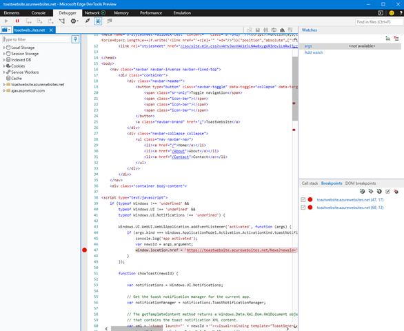 As you can see, one of the listed processes is exactly our Progressive Web App. Simply click on it and the debugger will be attached, allowing you to perform the same kind of testing you do with Edge, like placing breakpoints in JavaScript code or exploring the network trace. For example, if you open the Debugger section, in the left tree you can click on the URL of your domain and look for the JavaScript code you have added before to the main page of the website. Then you can place a breakpoint inside the registration of the activated event and see what happens when the application is started from a toast notification: