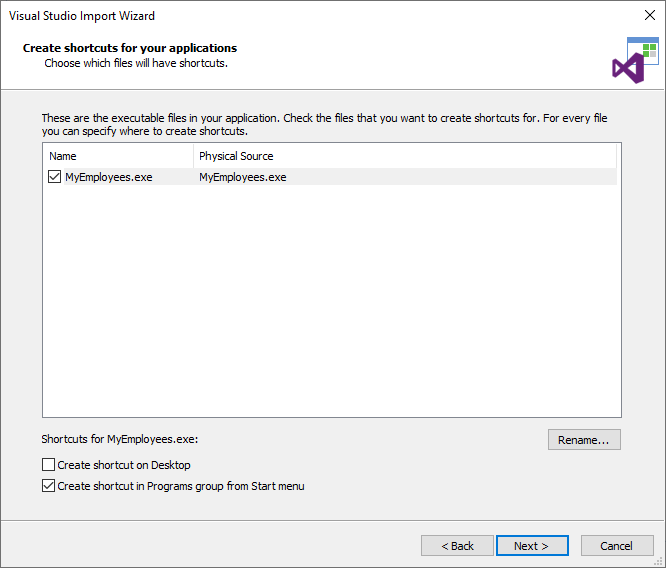 In the next step, you will need to select the main executable of your application. Advanced Installer should be able to automatically detect it, especially if it's a scenario like mine where the application is composed by a single executable. This information will be used to configure the shortcuts on the desktop and/or the Start Menu.