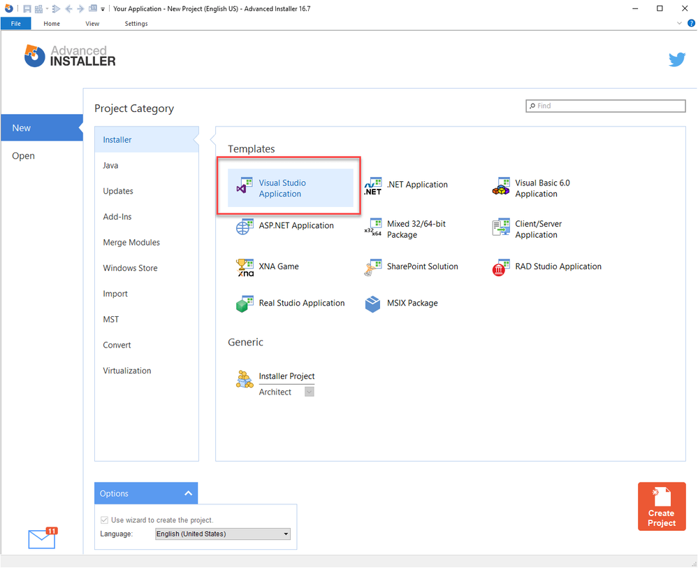 First you need to download and install the latest Advanced Installer version. It's a paid product, but it offers a 30 days trial and also a free tier. Once you have launched it, you will find in the Templates section one called Visual Studio Application, which is able to connect directly to a Visual Studio solution, like in our case.