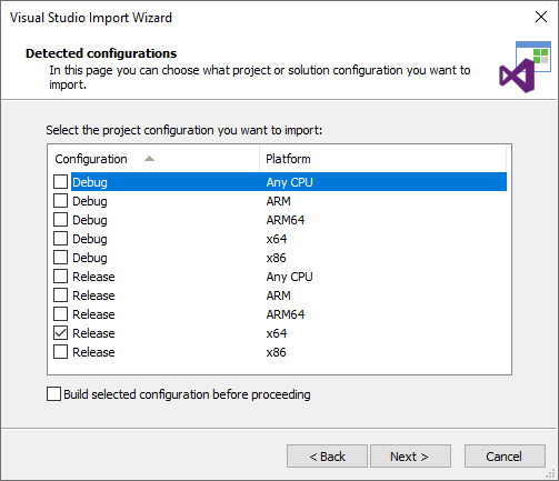 As next step, you must choose the Visual Studio solution which contains your project. In my case, I've chosen the MyEmployees.sln file. Advanced Installer will analyze the solution and it will ask you which configurations you want to import. Feel free to choose the ones that make sense for your project. In my case, for example, I want to distribute only the 64 bit version, built in Release mode: