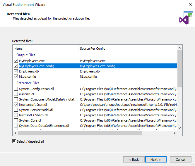In my case, I'm going to include all the output files, plus the reference files coming from NuGet, like JSON.net or System.Data.SQLite. I don't need to include the references related to the .NET Framework, since they are already installed on the machine.
