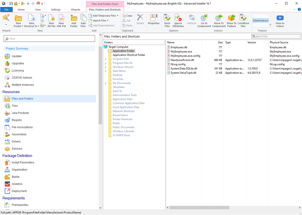 We're going to keep it simple, so we won't add any special configuration. However, there's a setting that is very important. Move to the Files and Folders section, which displays what and where the installer will copy on the user's machine. You will see a folder called Application folder, which is the location where the files which compose the application will be copied. However, you might see that not all the files are properly included.