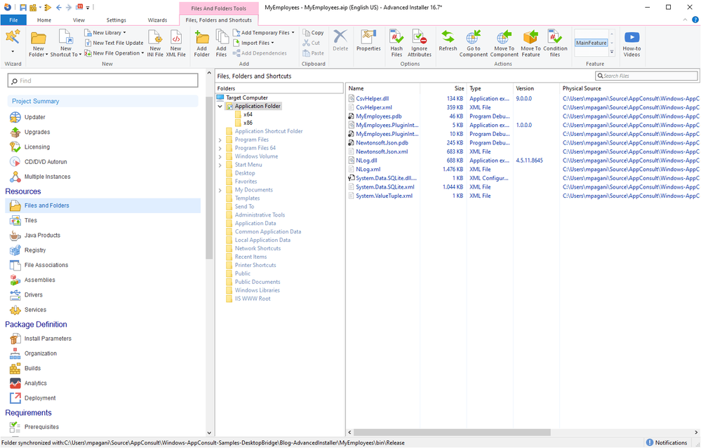 To achieve this goal we must enable the sync feature. Right click on the Application Folder in the tree and choose Properties. Then move to the Synchronize tab and click on Synchronize content with folder from disk. As source folder, you must specify the output of the build in the bin folder of your Visual Studio project. For example, since in my case I'm compiling the application in Release mode, I'm picking up the MyEmployees\bin\Release folder. Once you press Ok, you will be asked if you want to remove the files which are already included. Press Yes. You will notice now that all the files are correctly included: