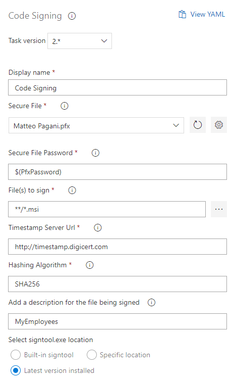 That's it. The next step is... well, it's up to you 😃 Now that the installer has been signed, you can add a task to deploy it in the place which makes more sense for you. For example, you can deploy it to a storage or a FTP, where the file will be linked by a web page. In my scenario, I'm using Azure Storage to store the file in a blob, so I'm using the task called Azure File Copy.