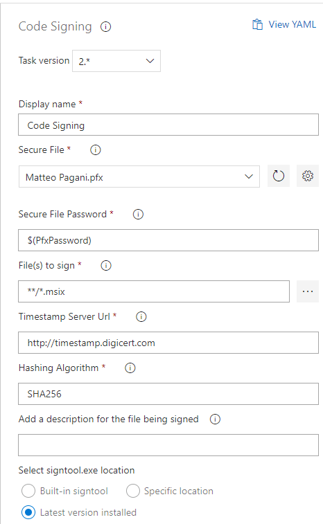 $(PfxPassword)in the Variables tab. - File(s) to sign is the path of the file to sign. In this case, we just set it to