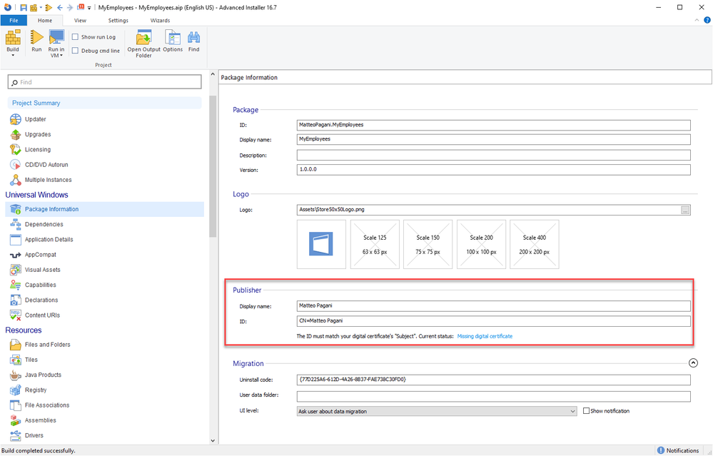 Pay attention that, in order for the signing to complete successful, the subject of the certificate must match the publisher declared in the manifest. You can check this in Advanced Installer. Move to the Package Information tab under the Universal Windows section and look for Publisher section: