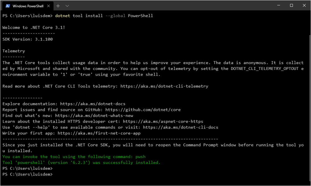 After installed, run the following command on Windows Terminal to install the PowerShell Core: